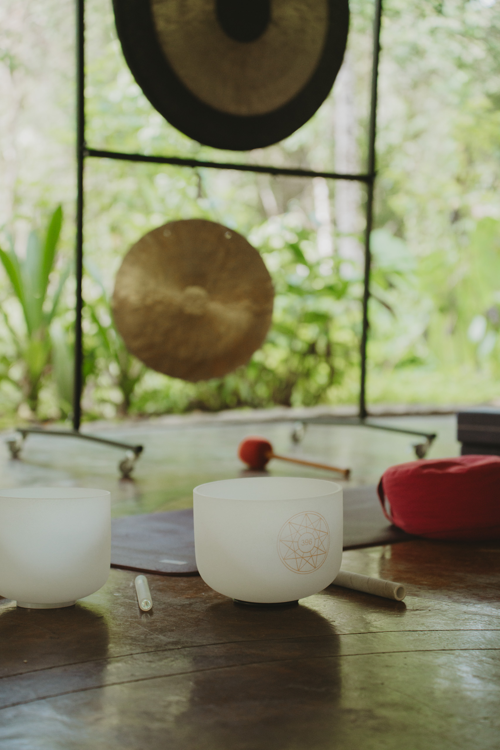 A person in a white dress is striking a large gong with a mallet in a room with arched windows. The space has a serene atmosphere with nature visible outside. An altar with candles and a crystal is in the background.